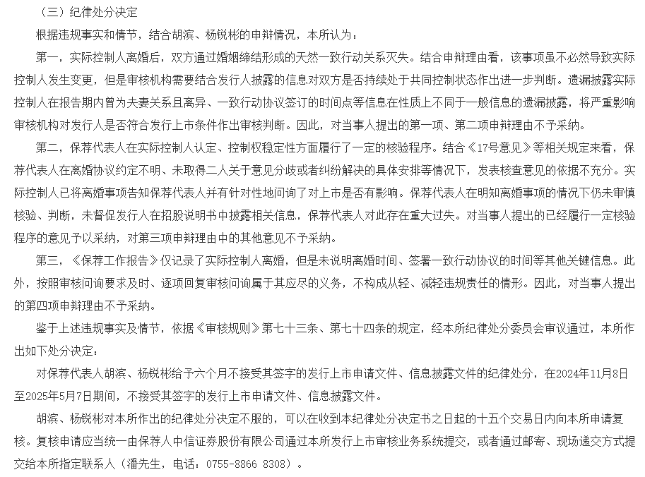 鉴于上述违规事实及情节,依据《审核规则》第七十三条、第七十四条的规定,经深交所纪律处分委员会审议通过,作出如下处分决定:对保荐代表人胡滨、杨锐彬给予六个月不接受其签字的发行上市申请文件、信息披露文件的纪律处分,在2024年11月8日至2025年5月7日期间,不接受其签字的发行上市申请文件、信息披露文件。