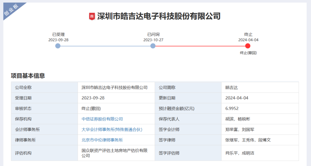 深交所网站显示,皓吉达的创业板IPO受理日期为2023年9月28日,今年4月4日更新的审核状态已变更为“终止(撤回)”。其保荐机构为中信证券,保荐代表人即胡滨、杨锐彬。