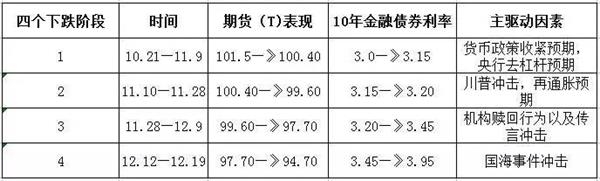3、11月28日—12月9日:国债期货从99.60跌至97.70,从回顾角度来看,本轮下跌较为剧烈,造成这轮下跌的主要矛盾