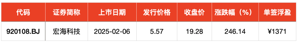 宏海科技2月6日挂牌上市,发行价格5.57元/股。截至上市首日收盘,宏海科技报收19.28元/股,涨幅246.14%。以收盘价计算,投资者中一签浮盈1371元。