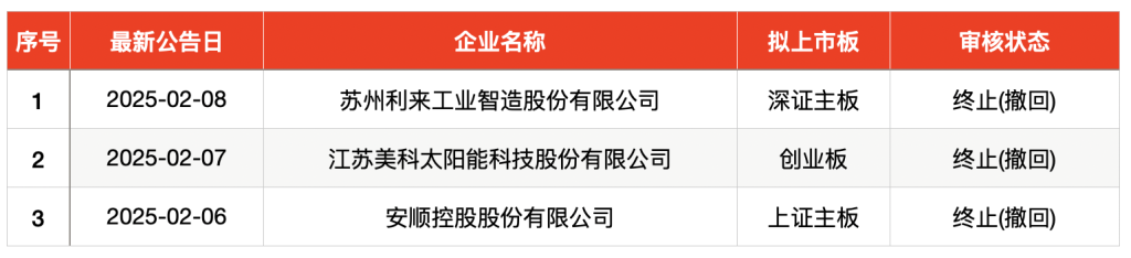 此外,上周共有3家企业IPO终止,分别为苏州利来工业智造股份有限公司、江苏美科太阳能科技股份有限公司、安顺控股股份有限公司。