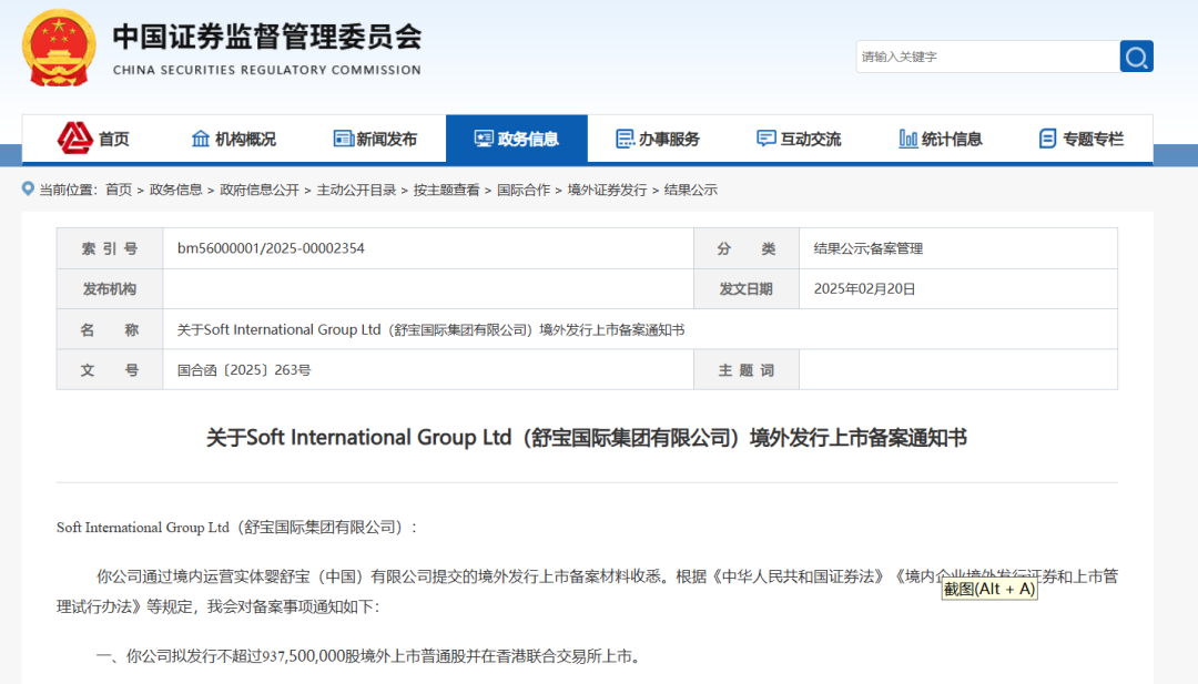 据中国证监会网站,2月20日,中国证监会发布关于舒宝国际集团有限公司(以下简称舒宝国际)境外发行上市备案通知书。