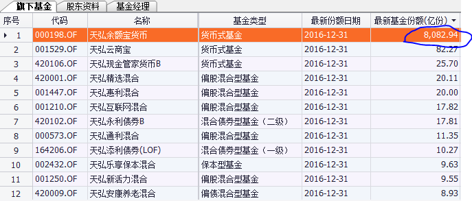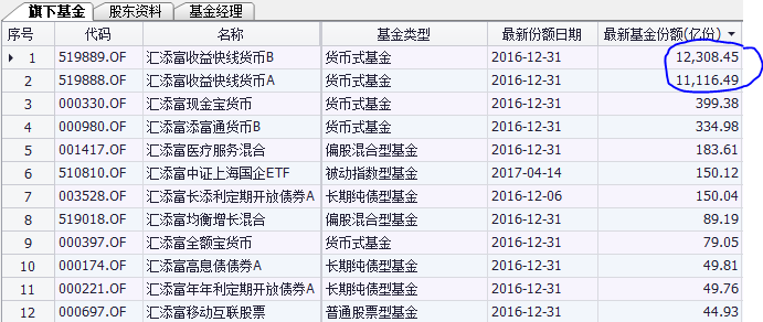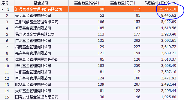 下图中,汇添富基金、天弘基金旗下基金产品的份额总量远高于其他基金公司,但是查看明细却是因为货币型基金的规模爆表导致的总量暴增。
