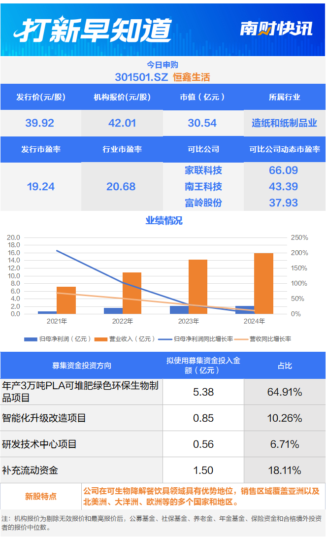 摘要:  3月7日,有1只新股可申购,为创业板的恒鑫生活(301501.SZ)。该公司是一家从事纸制与塑料餐饮具研发、生产和销售的国家级专精特新“小巨人”企业,在可生物降解餐饮具领域具有优势地位。  据招股...