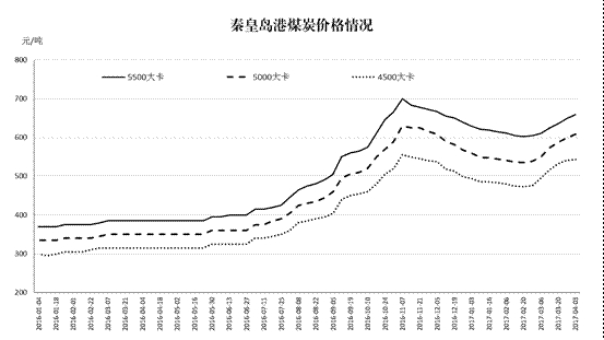价格回升较快。3月份以来,秦皇岛港煤炭价格[2]快速回升。截至4月初,5500大卡煤炭平仓价每吨659元,比3月初回升49元;5000大卡每吨608元,回升58元;4500大卡每吨543元,回升48元。