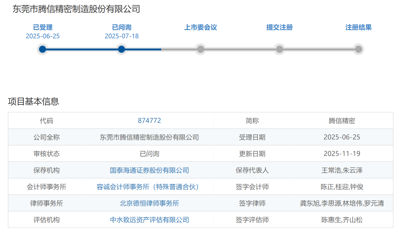 11月19日,北交所官网显示,东莞市腾信精密制造股份有限公司(简称“腾信精密”)披露了关于首轮审核问询函的回复,回应了与实控人相关企业关联交易 、业绩稳定性及下滑风险、境外销售真实性及收入确认合规性等问题。