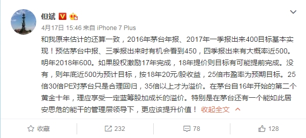 私募大佬但斌发表微博称,和我原来估计的还算一致,2016年茅台年报、2017年一季报出来400目标基本实现!预估茅台中报、三季报出来时有机会看到450,四季报出来有大概率近500。明年2018年600。如果股权激励17年完成,18年提价则目标有可能提前完成。没有,则年底近500为预计目标,按18年20元/股收益,25倍市盈率为预期目标。25倍30倍PE对茅台只是合理回归,35倍以上才为溢价。在茅台自16年开始的第二个黄金十年,理应享受一定蓝筹股加成长的溢价。特别是在茅台还有一个能如此居安思危的能干的管理层领导下,更应该提升价值!