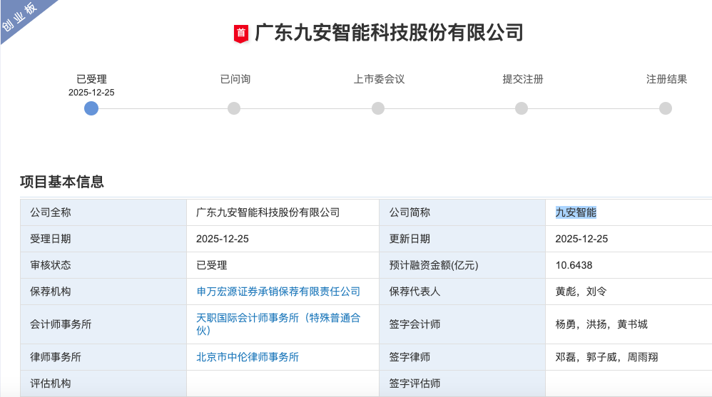 12月25日,深交所官网显示,广东九安智能科技股份有限公司(以下简称“九安智能”)创业板IPO申请获受理,保荐机构为申万宏源证券承销保荐有限责任公司。