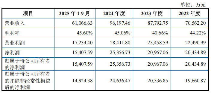 报告期内,公司营业收入分别为7.06亿元、8.78亿元、9.62亿元和6.11亿元,扣非净利润分别为1.97亿元、2.03亿元、2.46亿元以及1.49亿元。
