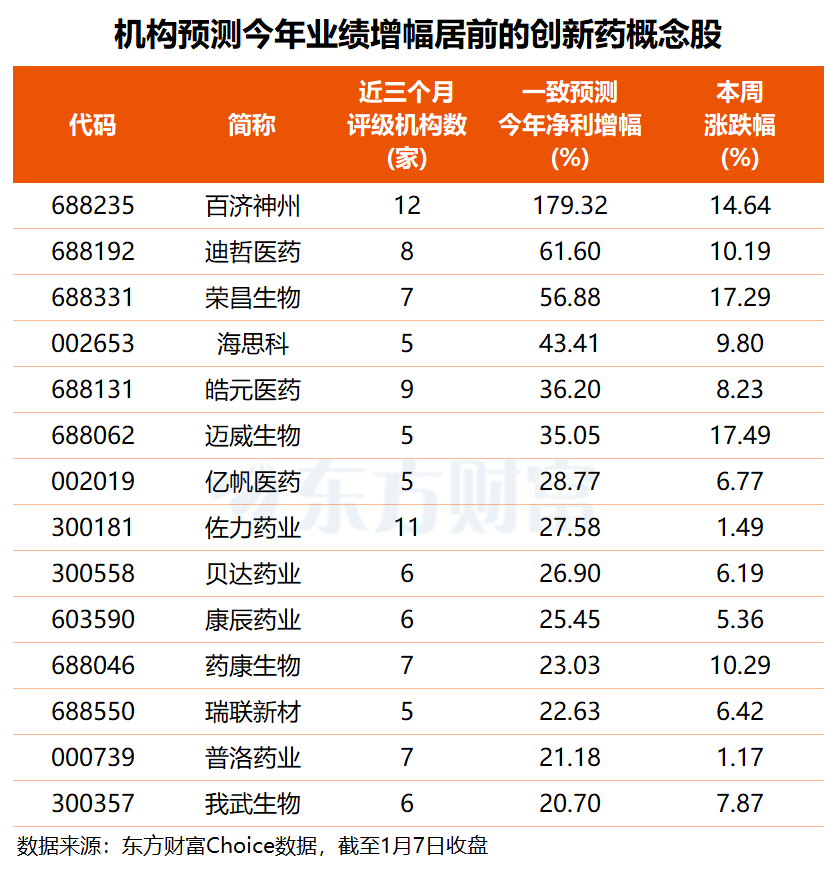 从未来增长潜力来看,根据5家以上机构一致预测,2026年有望实现净利增长的创新药概念股共30只,其中14股同比增幅或超20%。机构预计,百济神州今年净利有望同比大增1.8倍,迪哲医药、荣昌生物海思科净利增速有望分别达62%、57%和43%,皓元医药、迈威生物一致预测净利增幅均在三成以上。