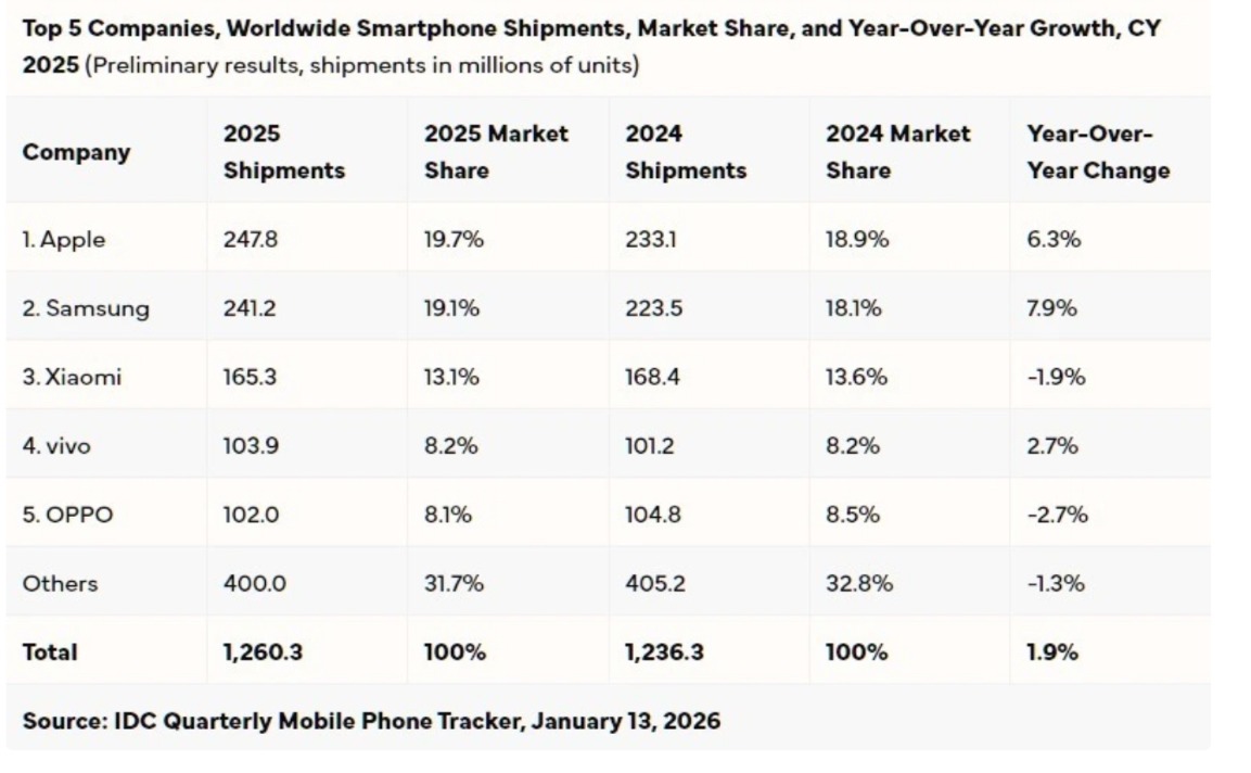 IDC 2025年手机出货量:华为重返中国第一,苹果在全球三连冠