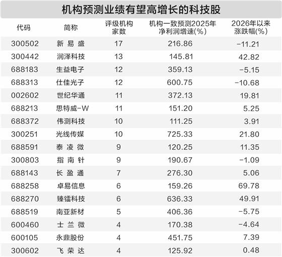业内人士表示,业绩高增长叠加科技题材,股价弹性或更大。据此,证券时报·数据宝统计出年报有高预增潜力的科技股,条件包括:1.公司2024年净利润为正;2.2025年前三季度净利润增速超100%;3.有3家及以上机构评级,且一致预测2025年净利润增速超100%。