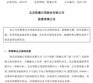 同日,凯德石英发布公告称,公司实际控制人张忠恕、王毓敏及其一致行动人张凯轩、北京德益诚投资发展中心(有限合伙)、北京英凯石英投资发展中心(有限合伙)正在筹划重大事项,拟将部分股权转让于宁波江丰电子材料股份有限公司,该事项可能导致公司控制权发生变更。