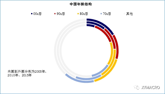 长周期驱动力之二:年龄结构与消费意愿。Ray Dalio(桥水基金的创始人)在分析国家的经济周期时曾将国家发展分为5个阶段:1)国家穷,居民也觉得自己穷;2)国家快速致富,居民仍然觉得穷;3)国家富,居民也觉得富;4)国有不再富,居民仍认为富;5)国家进入衰退,居民无法接受(Ray Dalio, 2015, ‘How the Economic Machine Works?’) 。在一个经济体仍处于发展的阶段时,也就是Ray Dalio所说的前三个阶段中,居民的消费意愿不断提升。换句话说,在这三个阶段中,从消费习惯来看,新生代的消费意愿是必然高于上一代的。这是本身收入水平提高以及居民对自身收入水平的认知提高的结果。所以,我们会感受到70后、80后、90后的消费意愿在逐步提升。