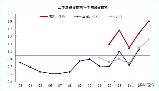 图 一线城市的二手房成交面积开始超过一手房