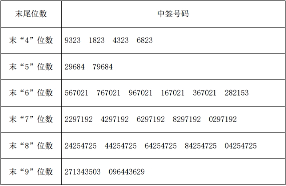 凡参与本次网上定价发行的投资者持有的申购配号尾数与上述号码相同的,则为中签号码。中签号码共有138,330个,每个中签号码只能认购500股周大生珠宝股份有限公司A股股票。