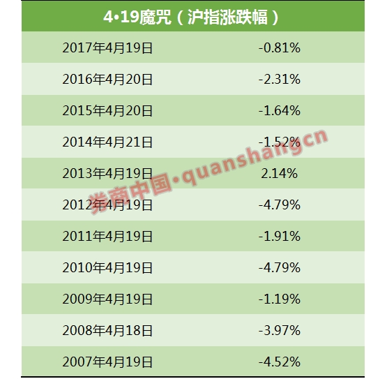 每年4·19,A股就没好过!周三A股再次迎来了“4·19”魔咒:从2007年开始,历史上的这一天,A股都离奇暴跌,无一例外:
