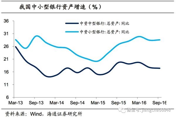 银行资产负债快速扩张。利率市场化推进的同时,银行业竞争加剧,过去稳定的存贷息差没有了政策保证,银行不得不做大规模,实行金融版的“薄利多销”模式。13年至16年,银行表内资产同比增速抬升,大型银行一般在10%-12%,而中小型银行的表内资产增速则高达16%-26%。