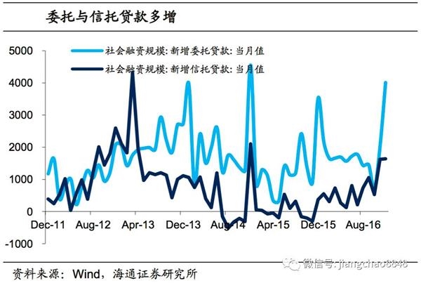 另一方面,银行委外和同业理财“吹大了金融泡沫”。16年存款型公司的股权及其他投资明显增加,16年末大型银行该项同比增速为4.6%,而中小型银行该项增速达到16.7%,银行委外和投资理财盛行。