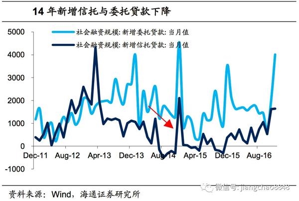 13年上半年,社融新增信托和委托贷款达到2.35万亿,约等于12年全年新增量。银行理财对接非标资产,规模迅速扩张,在这一阶段,非标资产能够提供8%-10%甚至更高的收益,实体经济通过委托、信托贷款等,为5%以上的理财收益提供了支撑。