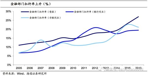 以其他存款性公司的债券发行、对其他存款性公司负债和对其他金融公司负债与GDP之比作为金融部门债务率的测算,可以看到,金融部门的债务率从50%上升到67%。其中,债券发行与GDP之比从13年的18%明显上升至16年末的27%。