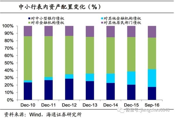 作为同业存单发行主力的中小行,由于信贷资源不及国有大行,其选择通过同业套利链条来扩张规模、以增强自身利润和竞争力。中小行资产端,购买同业理财、债券委外等使得对其他金融机构债权的比例持续上升,从14年的12%上升到16年9月的24%左右;对非金融企业债权占比则下滑,而对其他居民债权占比相对持平。