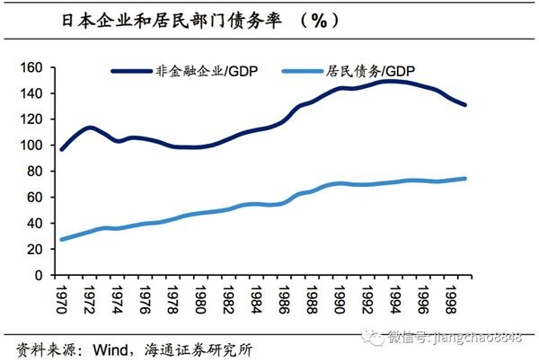 银行不断注水,非金融企业和居民部门加杠杆情况严重,债务负担加重。日本非金融部门负债占GDP比重从1985年的113.9%,上涨至1989年的139.2%,而居民部门的负债占GDP比重从1985年的48.9%,上涨至1989年的68.8%。大量的资金涌入地产行业,居民企业杠杆加重,为日本泡沫经济的破灭埋下隐患。