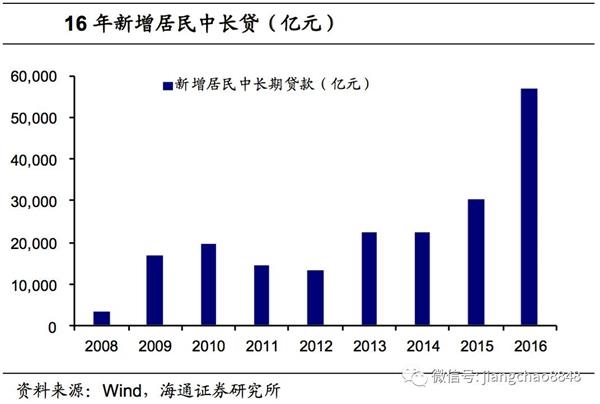 16年房价暴涨,居民房贷高增。银行通过个人房贷、地产开发贷、地产非标等为个人购买和地产商拿地开工提供源源不断资金,数据显示,16年我国居民中长贷增加5.68万亿,较15年的3万亿增长接近1倍,房贷放松推动地产销量回升,一二线城市房价飙升,并向三四线传导。