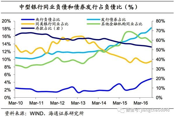 15-16年:同业存单兴起,主动负债增加。14年同业存单开始大量发行,开启了银行间存单利率市场化。同业存单的大量发行,使得银行资产负债表重新扩张,金融部门的同业+债券债务率从50%上升到67%。其中,债券发行与GDP之比从13年的18%明显上升至16年末的27%。截至17年3月末,存单余额达到7.78万亿,中小银行发行比例达到50%-60%。