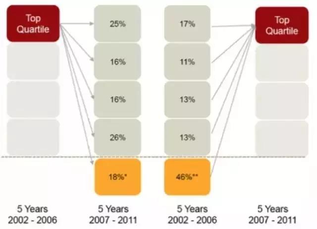 左侧为前5年排名前20%的基金在后5年的分布情况。可以看得到,只有1/4还留在前20%,其他散落各处,没任何规律。