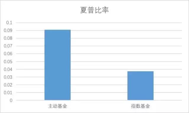 夏普比率是用基金的超额收益率/风险水平,形象点说,金融产品其实就是通过买卖风险获利的。夏普比率可以认为是基金买入一单位风险的获利,或者风险价格。主动基金承担一单位风险获利0.0908,而指数基金只能获利0.0375,前者足足是后者的2.42倍。