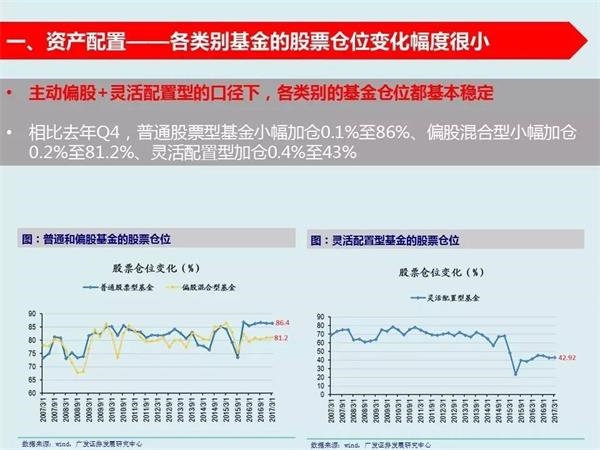 1、基金仓位相比相比去年Q4基本没有变化,已连续四个季度维持中性仓位——纯股票型基金小幅加仓0.1%至86.4%、偏股混合型基金小幅加仓0.2%至81.2%、灵活配置型基金加仓0.4%至43%,纯股+偏股混基加总后的仓位处于历史中性水平,且已保持了四个季度。