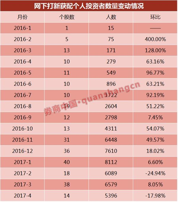 数据显示,网下配售获配人数增长迅猛,从最开始的不足百人获配,到7月份开始实现千人以上成功获配,在12月时更有7610名个人投资者成功获配,而在今年1月份更是创下了8112人的历史最高记录。