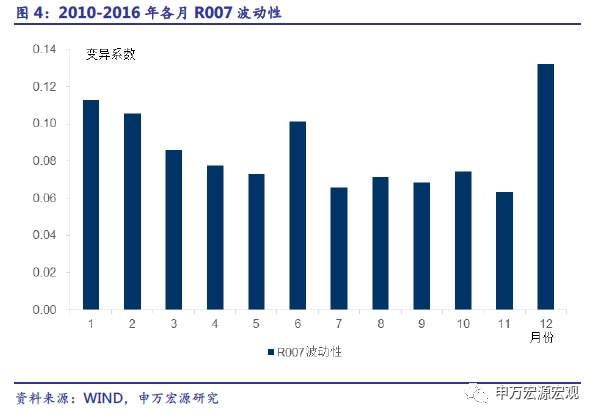 由于资金面趋紧后,央行往往会出手释放流动性来进行平滑,所以有时资金成本呈现先扬后抑走势,例如今年3月就是如此,这种情况下资金价格中枢变化可能并不明显,但波动巨大,因此考察其离散系数也是一个不错的选择。从数据来看,2010年至2016年月度资金价格的波动基本和中枢的季节性表现一致,在春节当月和年中、年末往往剧烈波动,其波动性显著高于其他月份。