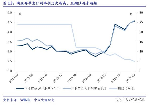 第四,监管趋严导致商业银行杠杆和期限错配风险暴露。今年来对商业银行监管持续加强,银监会密集出台多项监管文件,标志着此前部分银行通过表外理财、同业存单等快速冲规模,再通过加杠杆和期限错配冲利润的扩张模式开始受限。目前表外理财已纳入MPA考核,但同业存单尚未纳入广义信贷和同业负债考核,对发行方和投资方而言均具有较大吸引力。由于对相关监管措施即将出台且可能会采取新老划断的预期,银行打时间差冲规模的动机较强。3月份银行间同业存单发行超过2万亿,发行利率也攀升至4.5%左右,量价均创下历史新高,且期限越来越短。部分银行在资产负债期限错配严重的情况下,同业存单到期将带来巨大的资金滚动缺口,例如3月份同业存单到期量1.5万亿,创下历史新高,巨额滚动需求加大了短期资金面波动。