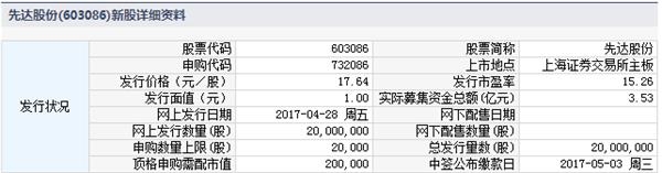 根据交易所公告,山东先达农化股份有限公司于2017年4月28日进行网上申购。本次发行股份数量为2,000万股,全部为发行人公开发行新股。网上发行数量为2,000万股,为本次发行数量的100%。