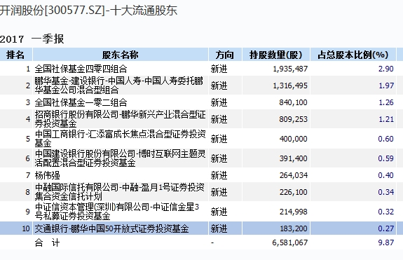 其中,开润股份一季度前十大流通股东中,三类机构占据了9席,分别为社保基金、公募基金、私募基金。持股比例占总股本的9.47%。