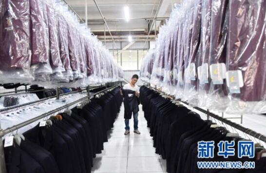 工人在雄安新区容城县津海服装工业园生产车间内整理成品服装(4月18日摄)