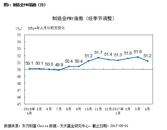 2017年4月份,中国最新发布的4月份中国制造业采购经理指数(PMI)为51.2%,较上月回落0.6个百分点,仍连续7个月保持在相对较高水平。4月份新订单指数为52.3%,较上月回落1个百分点,但仍保持在52%以上较高水平。从季节性特点来看,3月份是新一年生产经营活动计划的开始,企业开工率上升、市场订单集中释放特点明显,进入4月份有所回落是正常现象。装备制造业、消费品行业在52%以上相对较高水平稳中有升。高技术产业PMI指数继续保持领先水平,高于制造业整体水平2个百分点以上。大型企业PMI指数回落超过1个百分点,但指数水平仍保持相对较高水平,生产指数55%,新订单指数54.1%。中型企业PMI指数仍保持在50%以上。小企业PMI出现明显回升,升幅超过1个百分点,达到50%,为最近两年的最高水平,显示国家积极扶持政策逐渐显示成效,小企业生产经营形势呈现积极向好变化。