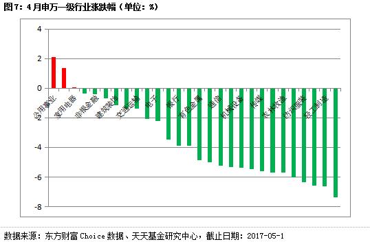 4月份行业板块方面,申万28个一级各行业近1月涨少跌多,公用事业、建筑材料涨幅居前。休闲服务、轻工制造、综合跌幅靠前。