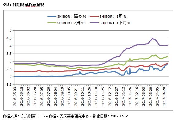 4月中旬以来,Shibor持续走高,隔夜拆借利率从4月12日的2.3857%直线上升至4月28日的2.8190%,创2015年4月3日以来新高。国债逆回购利率也持续上扬,4月27日,国债逆回购利率一度飙至12%。五一劳动节前一周,尽管为净投放资金,但是Shibor隔夜、1周、2周和1个月仍然全线上涨,周五收盘环比分别上涨20.27BP、10.99BP、7.48BP和1.42BP;DR001和DR007分别环比上升21.04Bp和37.23Bp.