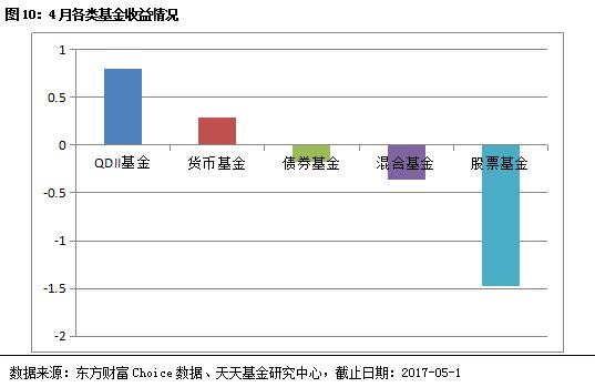 4月份A股下调明显,权益类基金表现最差,QDII基金表现出色。货币基金收益稳健,债券基金受资金面影响较大。4月份股票基金、债券基金、混合基金、QDII基金、货币基金指数的涨跌幅分别是-1.4719%、-0.1783%、-0.3641%、0.7971%、0.2833%。