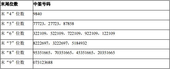 凡参与网上定价发行申购深圳市金溢科技股份有限公司股票的投资者持有的申购配号尾数与上述号码相同的,则为中签号码。中签号码共有53136个,每个中签号码只能认购500股深圳市金溢科技股份有限公司股票。