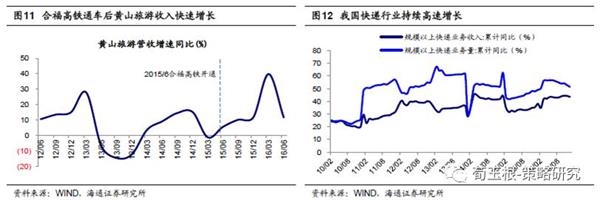 交通物流等基建设施不断完善。高铁等交通物流体系的不断完善也同样有利于三四线城市发展,16年7月国务院通过《中长期铁路网规划》提出未来将建设“八横八纵”铁路网。根据规划,“十三五”期间新建铁路将不低于2.3万公里,未来10年高速铁路里程将从现有的1.9万公里增加至3.8万公里,高速铁路网基本连接省会城市和其他50万人口以上大中城市,实现相邻大中城市间1—4小时交通圈。高铁建设会促进城市间的交流,改变我国居民的出行和生活方式,“高铁3小时生活圈”的新概念正在出现。高铁、高速、航空等交通物流体系的不断完善,也有利于我国消费服务业发展。基于完善的交通基础设施,我国快递行业已经连续6年保持50%左右的增速,成为现代服务业的重要组成部分。高铁对景区城市的拉动效应同样立竿见影,如15年6月合福高铁开通后,黄山旅游收入快速增长,16年Q1收入同比增速最高接近40%.