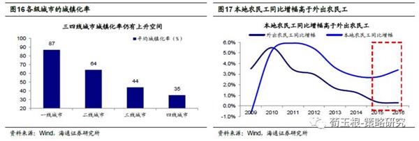 人口流动的趋势正在发生变化。从城镇化率角度看,一二线城市城镇化率分别达到87%和64%,城镇化率水平已经相对较高。而三线城市城镇化率44%,四线城市35%,城镇化率仍有向上空间。未来随着产业下沉、三四线城市基础设施日益完善,三四线城镇化率有望进一步提升。根据统计局数据,我国外出农民工同比增速从2010年起连年下降,近两年仅维持在0.3%左右,而本地农民工的同比增幅近五年来一直高于外出农民工同比增幅,且在2016年有所回升,从2015年的2.7%回升至3.4%。这反映出农民工进入一二线城市的意愿有所降低,而更加愿意留在本地就业。