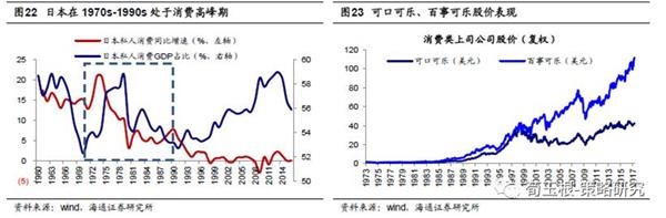美国、日本消费高峰期伴随本土品牌的崛起。美国、日本在1970s-1980s都经历了消费高峰期,消费需求爆发也促进了相应的本土品牌发展。70年代初,美国私人消费支出GDP占比迎来向上的拐点,从1970年的60%持续上升至目前的68.7%。并且1970s-1980s期间,美国个人消费支出同比增速平均在9%的较高增速。这一时期美国诞生了如可口可乐、百事、迪士尼、宝洁、强生等一批全球知名的消费服务类企业。从1970-2000年,可口可乐、百事可乐的市值最大涨幅分别达到20倍、30倍,同期EPS涨幅分别达到27倍、18倍。日本在1960年宣布启动“国民收入倍增计划”,通过减税、加速折旧等政策措施促进经济发展,也为后期消费的爆发奠定基础。日本私人消费GDP占比从1970年初的52%持续上升至1979年的58%,同期私人消费同比增速维持在15%左右。80年代日本私人消费的同比增速也维持在5.6%以上的较高水平。这段时期内日本也诞生了如丰田汽车、索尼、松下电器等为代表的汽车、电子等消费制造业品牌。日本在1967年超过德国而成为第二大汽车生产国,70年代丰田、日产、富士重工、铃木等公司迅速成为世界级的汽车生产商,从1970-2000年,丰田汽车市值涨幅最高达46倍。