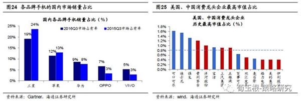 中国的自主品牌正在崛起。当前我国人均GDP在8000美元左右,相当于美国、日本的70s、80s年代,居民消费需求爆发,并且也将推动国内自主品牌的发展。以家电、消费电子和汽车产业为例,我国自主品牌的渗透率在不断提高。我国的家电市场已经被国有品牌主导,格力、美的、海尔合计在空调行业市占率达49%,海尔在冰箱领域的市场占有率达39%,远超西门子的13%和三星的7%.2016年国内彩电市场外资品牌的市占率也已经降至15%以下。消费电子领域,国有品牌迅速崛起,国产手机的市场占有率近几年迅速提高。根据Gartner统计数据,截至2016Q3华为、OPPO、Vivo等国产品牌手机合计市场占有率已经达21%,超过市场占有率第一的三星的19%,相对于2015Q3的14%也明显提高。2016年我国汽车自主品牌也迎来快速扩张。2016年我国乘用车销量首次超过2400万辆,同比增速15%,而中国品牌乘用车销量首次超过千万辆,同比增长20.50%。中国品牌乘用车的市场占有率达到43.2%,其中中国品牌SUV、MPV的市场份额更是高达58%、90%,三四线城市成为自主品牌SUV的重要市场,未来汽车自主品牌有望复制家电和手机领域自主品牌崛起的趋势。